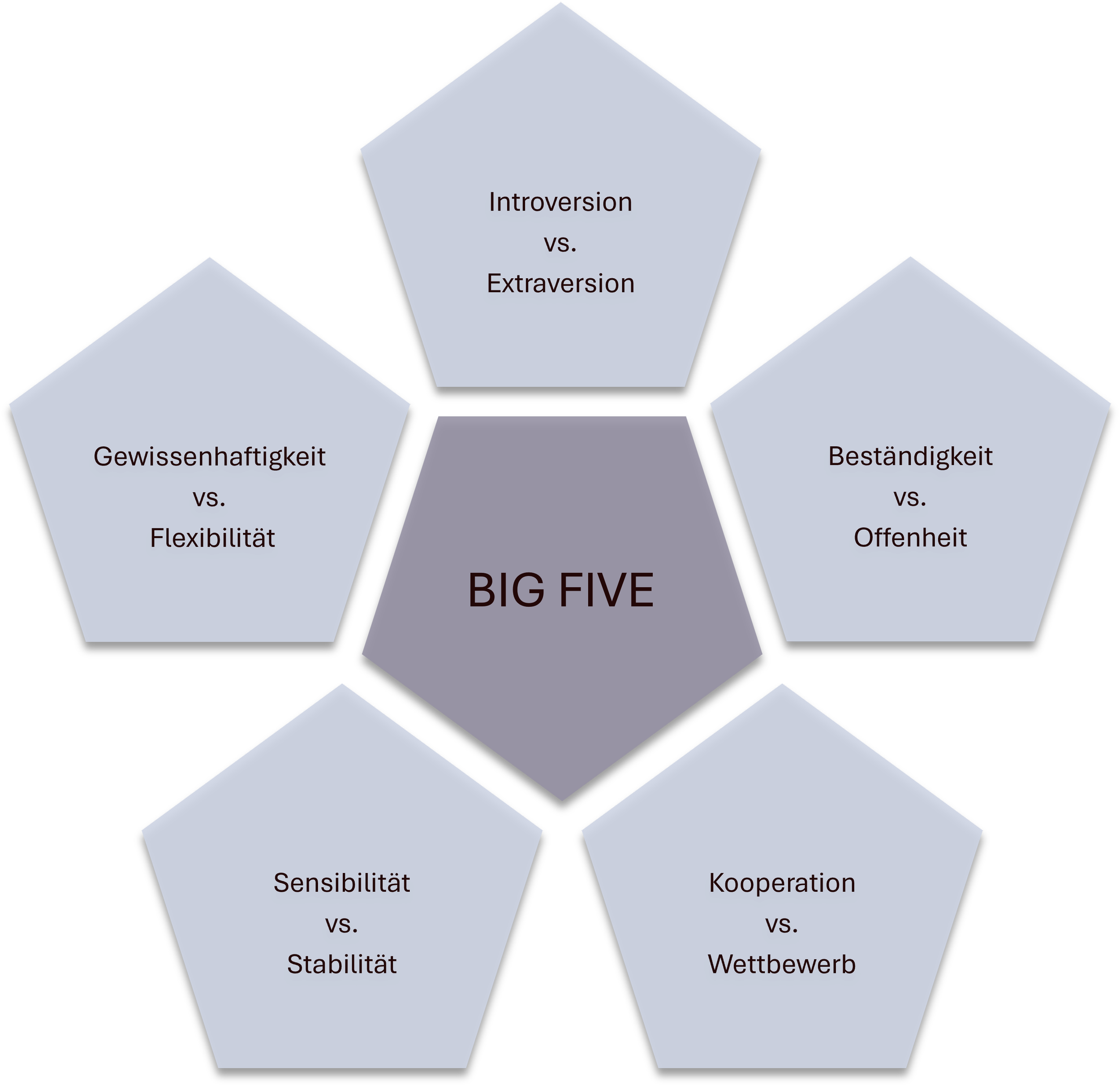 Die fünf Faktoren der BIG FIVE sind: Offenheit für Erfahrungen, Gewissenhaftigkeit, Extraversion, Verträglichkeit und Neurotizismus.
